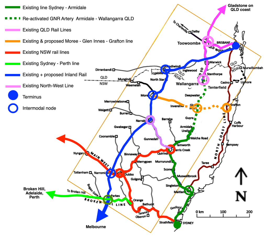 1) Re-activate the Great Northern Railway (GNR) asThe GNR Artery, north from Armidale to Wallangarra in QLD, for both freight and passenger rail services.