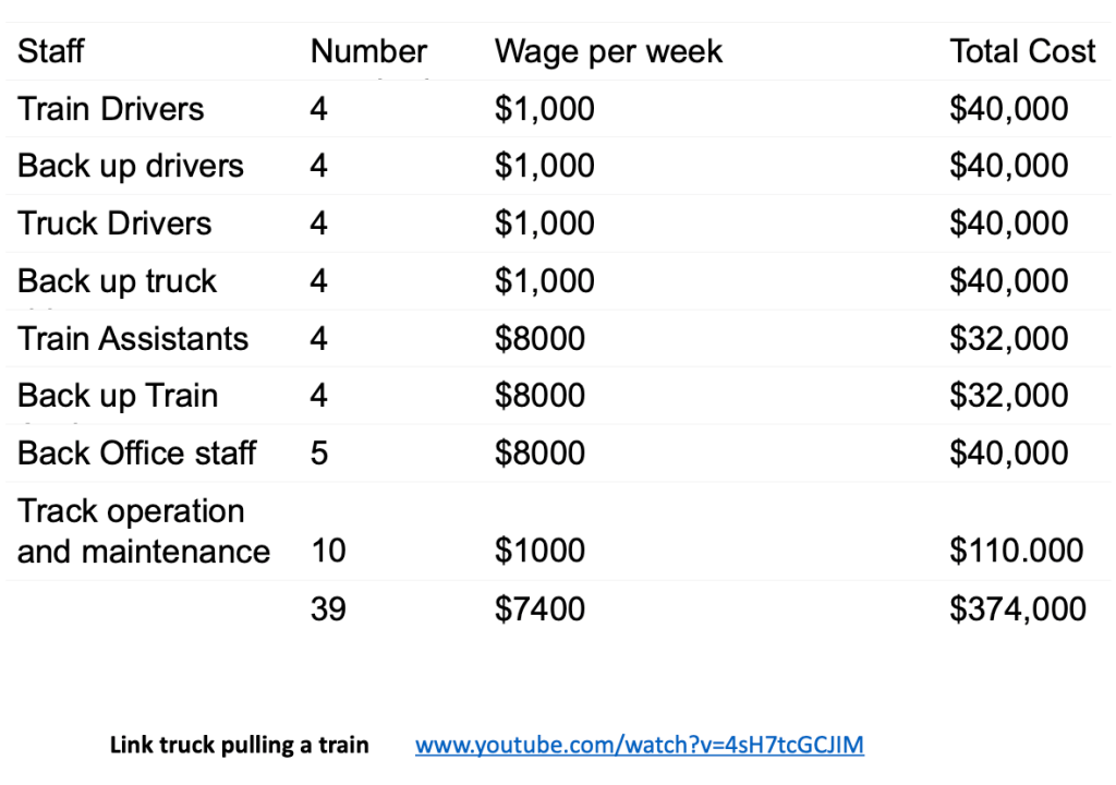 The 500 tonne train concept is designed to be low in supporting staff numbers. The following table indicates the requirements as FTE. Positions.